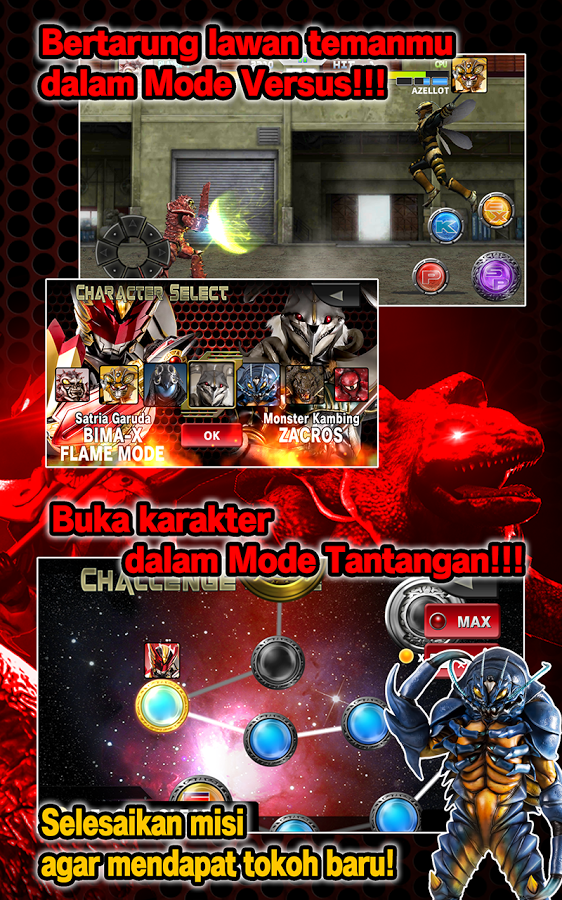 Азиатское телевизионное шоу "Satria Garuda BIMA-X» теперь на мобильных устройствах в виде файтинга. Наслаждайтесь увлекательными поединками один на один вместе с любимыми персонажами. Выберите один из пяти уровней сложности, от новичка до эксперта. Пройдите всех соперников в режиме испытания или сразитесь с друзьями через Bluetooth.