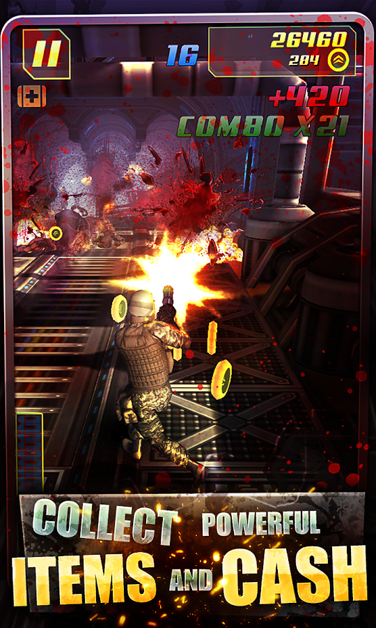 Zombie Apocalypse Gear Marines – раннер на андроид, где вы возьмете в руки автомат и будете убивать зомби. В этой игре вы возьмете на себя роль отважного пехотинца, которому выпала непростая миссия очистить космический корабль от зомби. Космический корабль, которому предстояло лететь на далекую планету, перестал отвечать, командование приняло решения послать туда бойца пехоты, чтобы узнать что на самом деле там случилось. Бегайте по отсекам корабля и уничтожайте всех членов экипажа, которые превратились в ужасных зомби, с помощью мощного оружия. Уничтожьте всех зомби и очистите корабль от зомби, не давая им укусить себя. Зарабатывайте деньги и приобретайте новое снаряжение для бойца и различные костюмы.