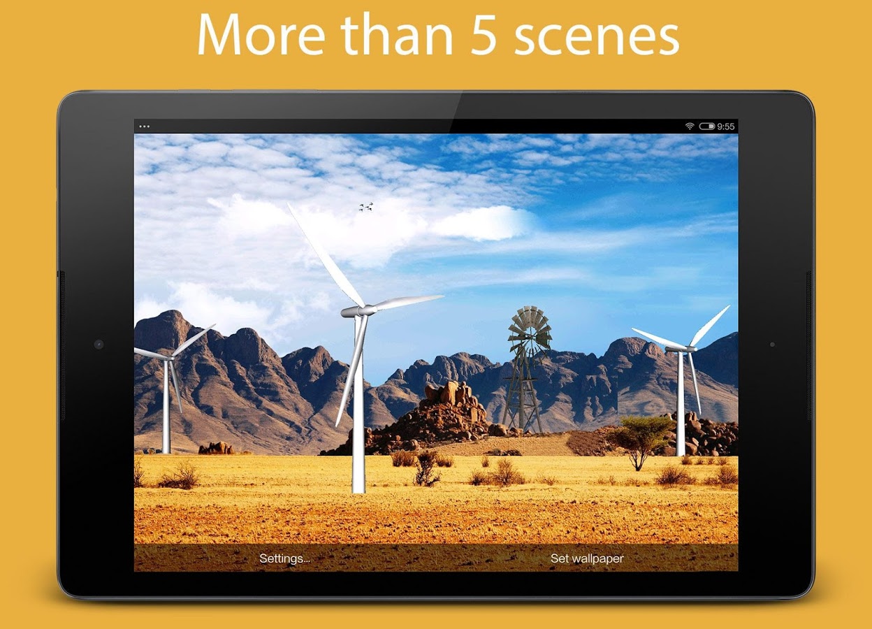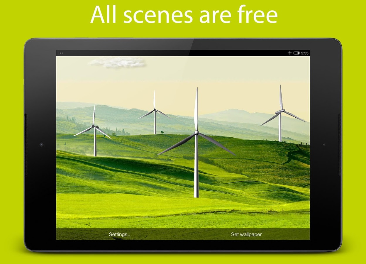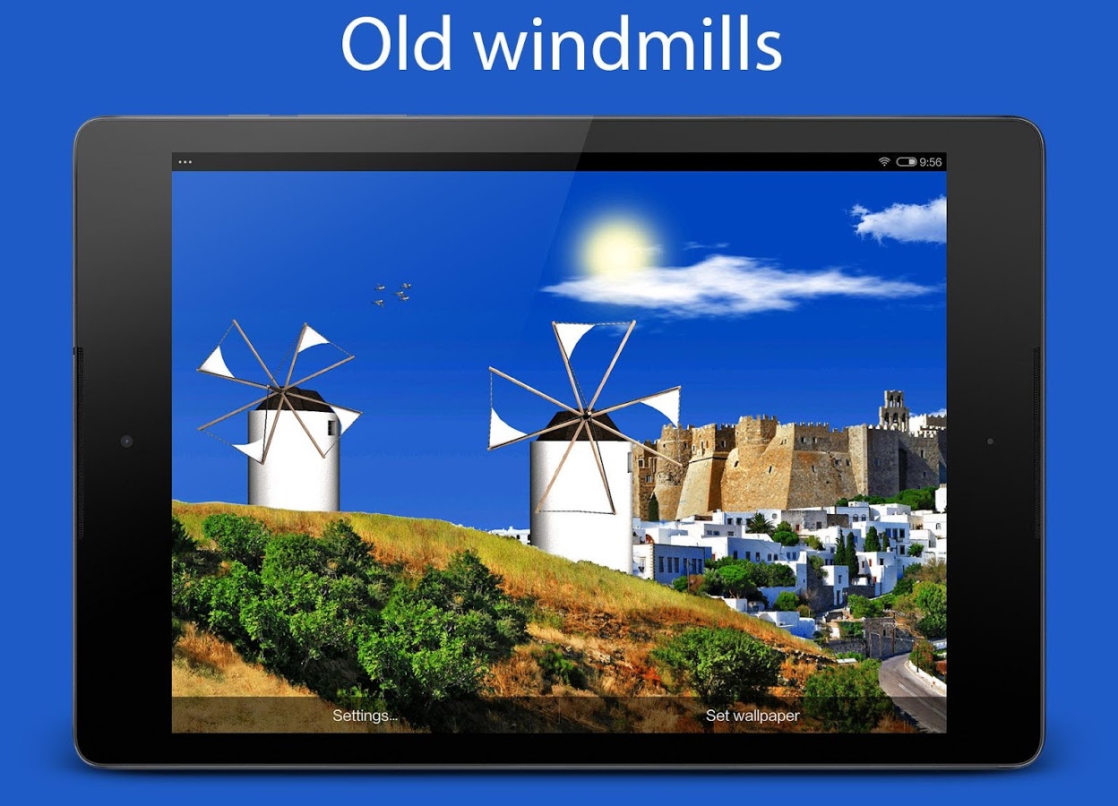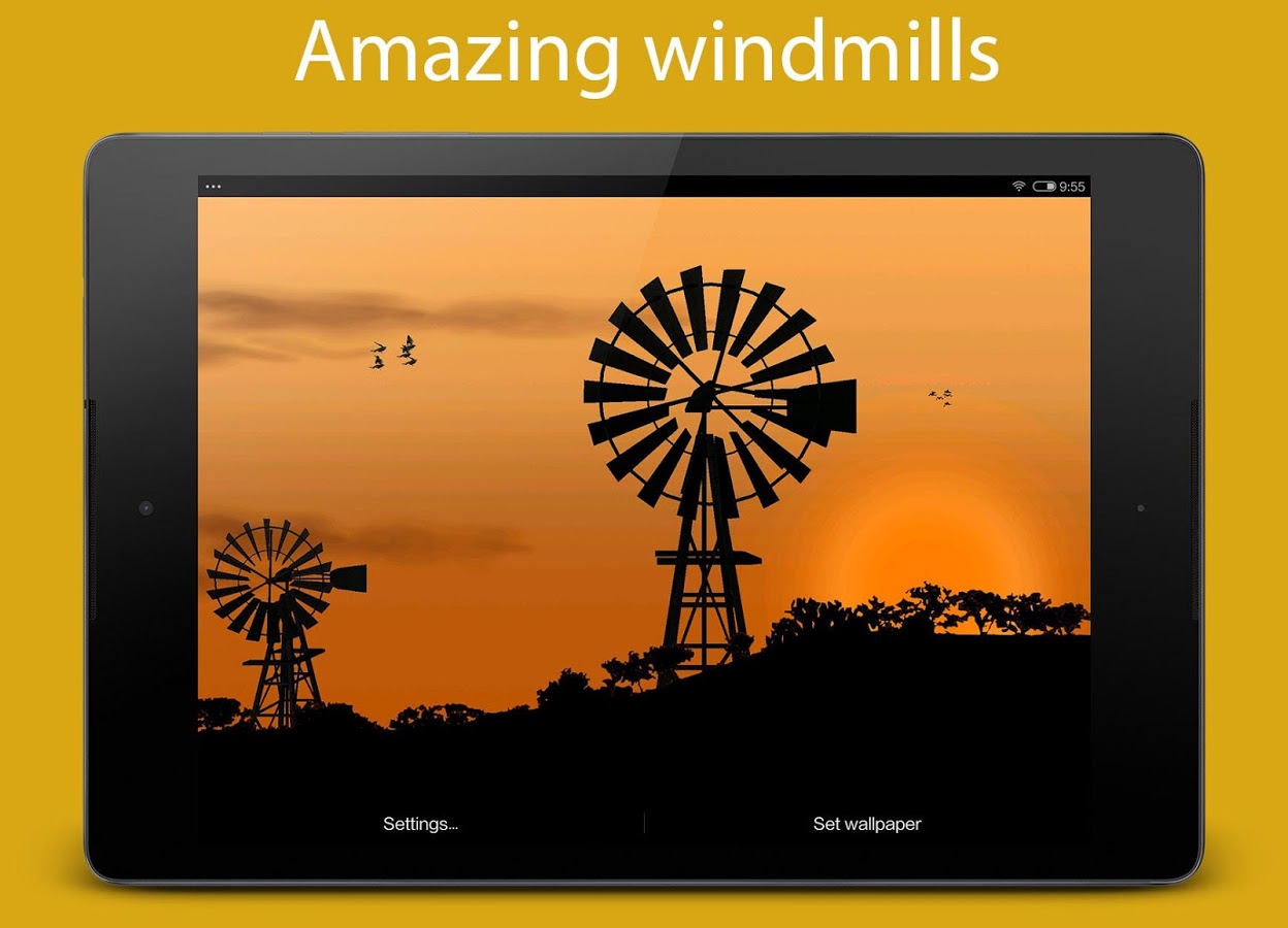 Windmill Live Wallpaper - живые обои на ваш телефон или планшет, где вы будете наслаждаться ветряными мельницами. Если вы любите смотреть на ветряные мельницы, как они вращают свои лопасти при движении ветра и вырабатывают тем самым энергию, то эти живые обои для вас. Установив эти обои, вы получите большое разнообразие различных анимированных картинок с изображением на них старинных каменных мельниц, которыми славиться Голландия, и современных ветрогенераторов, которые расположены на всем побережье солнечной Калифорнии. Эти обои порадуют вас разнообразными настройками и горизонтальной ориентацией.