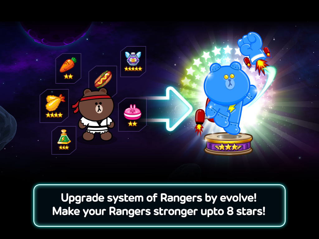 LINE Rangers – эпические бои с милыми, очаровательными, мультяшными героями на андроид. В этой игре вашей команде из различных героев предстоит выступить против инопланетян, напавших на вашу планету и взявших в плен милашку Салли. Сражайтесь очаровательными персонажами против мощных врагов и улучшайте ваших героев, а также призывайте на помощь своих друзей, чтобы выиграть трудный и продолжительный бой. В этой игре присутствуют не только знакомые вам герои, но и новые виды персонажей которых более 150, комбинируя их, вы повысите уровень своих героев. Сражайтесь бок о бок со своими друзьями и побеждайте врагов.