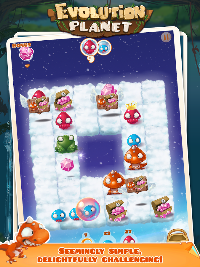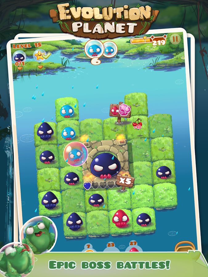 Evolution Planet – игра подарит вам незабываемые ощущения радости. Отправляйтесь в приключения на поиски сокровищ вместе с весёлыми жителями болот и водоёмов. Проходя уровни мы передвигаемся с одного острова на другой. Если мы совместим три объекта одинакового цвета то они эволюционируют в другое существо, и так пока не превратятся в лягушек. Откройте все виды существ, доступных в игре: три амебы - получится медуза, три медузы – выйдет лягушка. Три лягушки эволюционируют в … и так, пока не появится динозавр. 6 великолепных, красочных островов ждёт своего игрока. В игре присутствуют боссы.