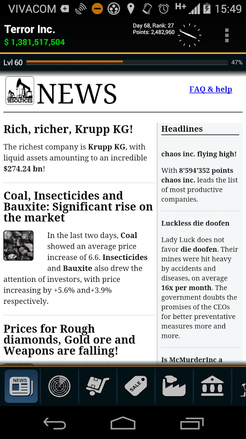 Resources Game – стратегия на андроид, где вам предстоит возглавить компанию по добыче полезных ископаемых. В этой игре для вас откроется огромная карта всего мира, где вам предстоит добывать полезные ресурсы и ископаемые. Путешествуйте по всему миру и открывайте для себя все новые и интересные месторождения угля, нефти, золота и других не менее значимых ресурсов. На месте, где есть руда, стройте шахты по добыче, устанавливайте буровые вышки, добывая нефть в огромных количествах и продавайте все, что добыли, на рынке, получая за это огромные деньги. На заработанную прибыль улучшайте и расширяйте свою компанию, делая ее огромной корпорацией, уничтожая при этом своих конкурентов.