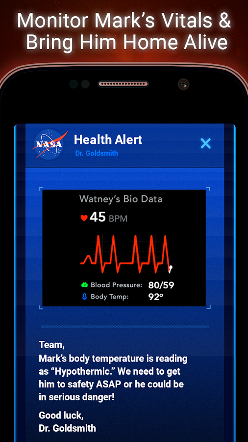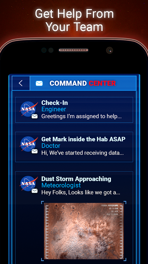 Эта игра является официальной игрой по голливудскому фильму "Марсианин". В игре вам предлагают стать самым настоящим специалистом NASA. Каким-то образом вам получилось связаться с одним из астронавтов, его группа исследовала поверхность Марса, и из-за некоторых обстоятельств он остался сам на огромной безлюдной планете. Именно вы являетесь надеждой на спасения этого астронавта, вам придется принимать нелегкие решения. Сможете ли вы помочь ему и вернуть домой целого и невредимого?