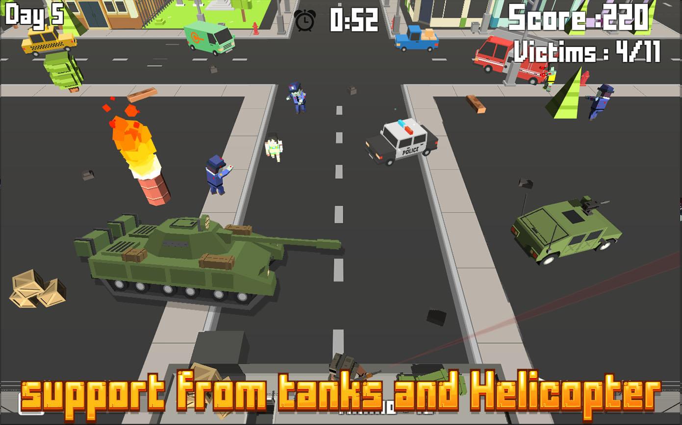 Pixel Shooter Zombies – экшен на андроид, где вам предстоит выживать в мире после апокалипсиса. В этой игре вы будете управлять кучкой людей, которые выжили после апокалипсиса и сражаются за свою жизнь. Убегайте от полиции и зомби, при этом взаимодействуя с различными объектами, которые находятся на улицах города. Отстреливайтесь от врагов и зомби с помощью мощного оружия и не подпускайте их достаточно близко к себе. Принимайте помощь от союзников, которые владеют танками и вертолетами, и не забывайте развивать своих персонажей, добавляя им снаряжения и вооружая мощными пистолетами и пулеметами.