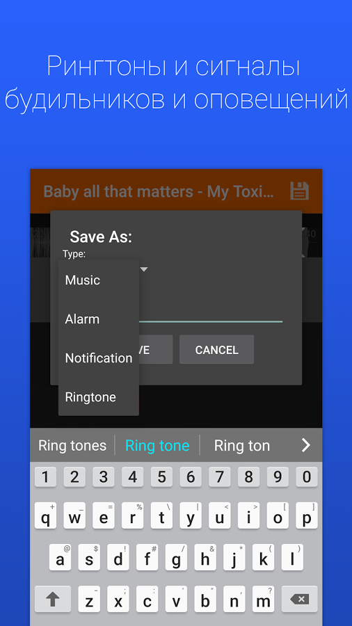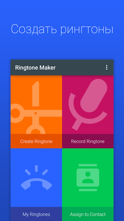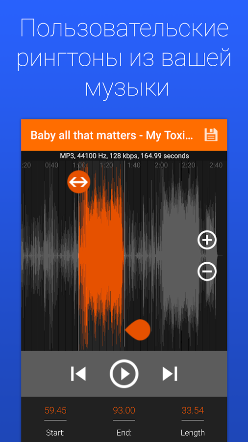 Благодаря Ringtone Maker вы можете записать музыку для последующего её редактирования, выбрать что-либо из своей фонотеки и вырезать отрывок для рингтона. Для отметки отрывка вы сможете использовать специальные бегунки или указывать точное время начала и конца отрывка. Созданные файлы можно использовать не только для звонков, но и других уведомлений, будильников и т.д.