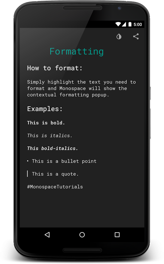 Писать заметки, или даже короткие зарисовки на смартфоне или планшете легко и приятно, но иногда сопутствующие приложения настолько перегружены дополнительными элементами, что работать с ними становится сложно. Monospace Writer - редактор другого типа: здесь нет ничего лишнего, только самое основное.