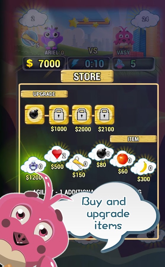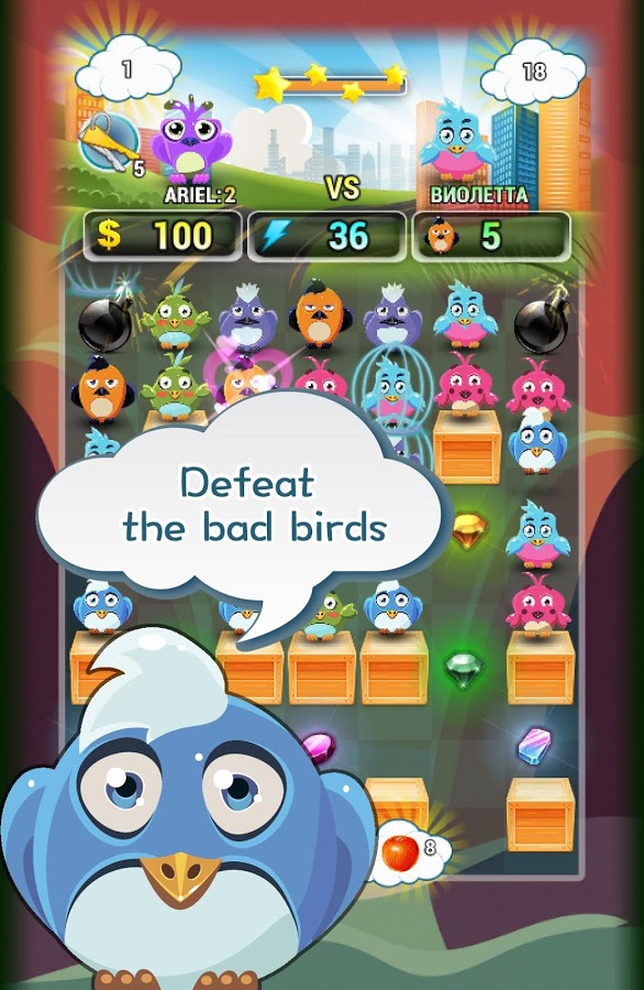 Birds Bomber Match3 Puzzle – игра из жанра три в ряд, где вам предстоит помогать маленькой птичек Ариэль. У нашей птички заболел ее малыш и срочно нужен доктор. Ариэль летит на помощь, но ей мешают злые птички, справиться с которыми можно только воспользовавшись бомбами. Перемещайтесь по игровому полю и расставляйте бомбы в нужных местах, используя для этого свое логическое мышление. Проделывайте комбо удары и собирайте полезные кристаллы и различные предметы, которые помогут увеличить мастерство и способности маленькой птички. Выполняйте различные задания и открывайте для себя новые способности.