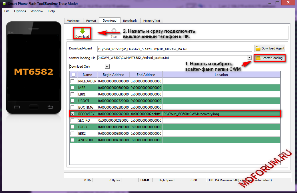 6. В программе нажать кнопку Download и сразу подключить выключенный телефон. Процесс прошивки рекавери начнётся автоматически.