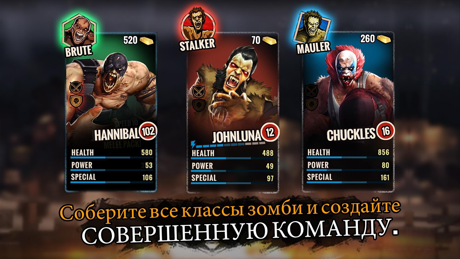 Ваша миссия состоит в создании команды бойцов-зомби, вооруженной до зубов различными видами устрашающего оружия и готовой столкнуться с нежитью лицом к лицу в жестоких матчах боевой лиги. Соберите три класса зомби, каждый из которых использует уникальные способности, силу, мощь, атаки и гибкость для победы над могучими соперниками.