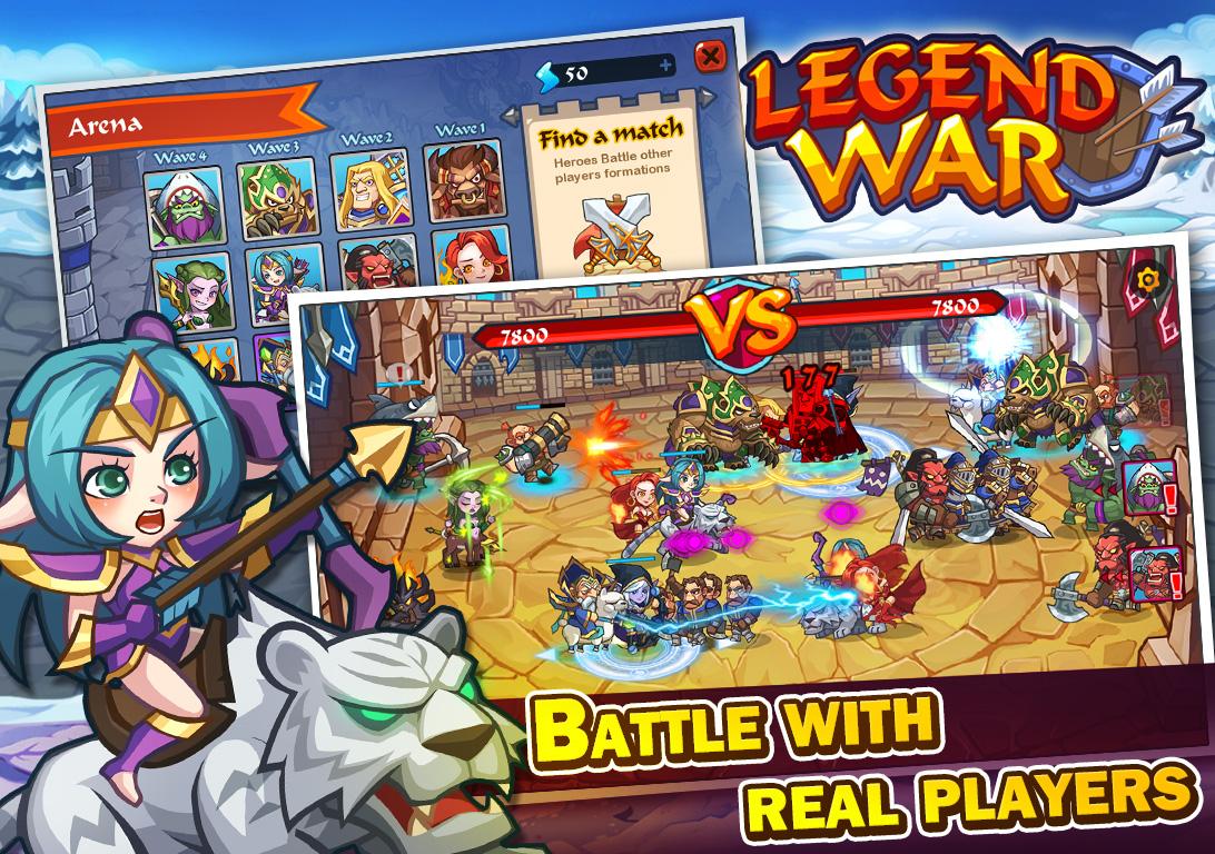 Legend War - увлекательная RPG, которая объединяет в себе элементы тактической стратегии из серии стенка на стенку, элементы ролевой игры и геймплейную механику tower defense. В целом игровой процесс уже далеко не нов, по разные стороны экрана находятся базы игроков, задача каждой из сторон уничтожить крепость соперника и защитить свою. Для этого у вас будет широкий арсенал солдатов, боевых машин, оборонительных сооружений. Конечно же все это вы получите далеко не сразу, одержав несколько побед и заработав очки опыта и премиальные вы сможете развить новых юнитов и умения. Как и в большинстве игр данного жанра, в Legend War отличная графика и озвучка, позволяющая прочувствовать сказочную атмосферу игры.