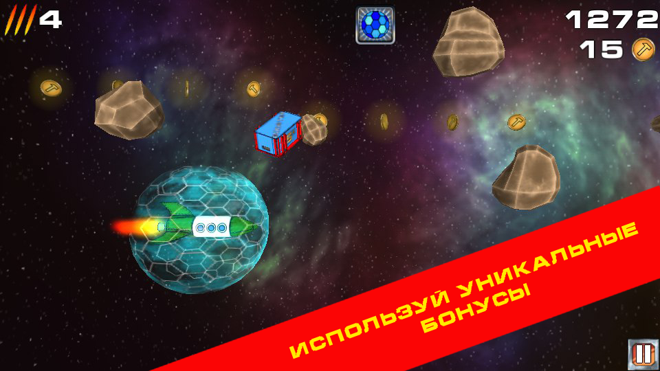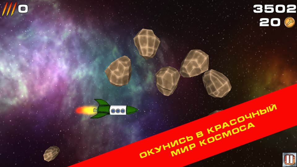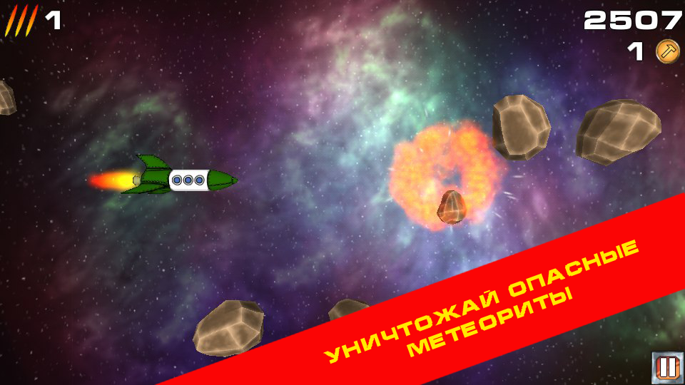 Игровой процесс очень красочный. На заднем плане проносятся разнообразные туманности, передающие объем и глубину космоса. Но не обольщайтесь таким спокойствием. Вам предстоит уворачиваться и уничтожать, летящие на вас метеориты. В любой момент они могут столкнуться друг с другом и поменять направление, так что вам нужно будет оставаться всегда начеку. Если же столкновение с кораблем неминуемо, используйте оружие, но не забывайте, количество зарядов ограниченно и тратить их нужно с умом.