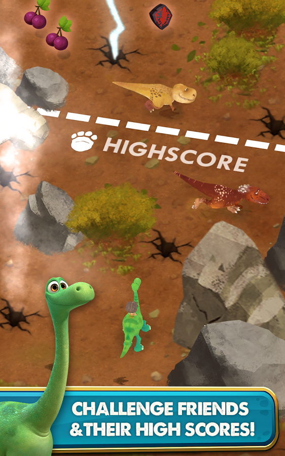 The Good Dinosaur – официальная игра, сделанная по сюжету одноименного мультфильма Дисней. В этой игре вы познакомитесь с добрым динозавром по имени Арло и маленьким мальчиком Спотом. В игре вы отправитесь в доисторический мир, где правят динозавры, и будете там выживать. Помогите динозавру и его другу пройти по опасным землям как можно дальше, и при этом уклониться от злых птеродактилей и хищных динозавров, которые захотят вас съесть. Пересекайте реки, поля, пропасти и другие препятствия, собирайте фрукты и бонусы. Каждый новый уровень порадует вас различными мирами и отличными бонусами.