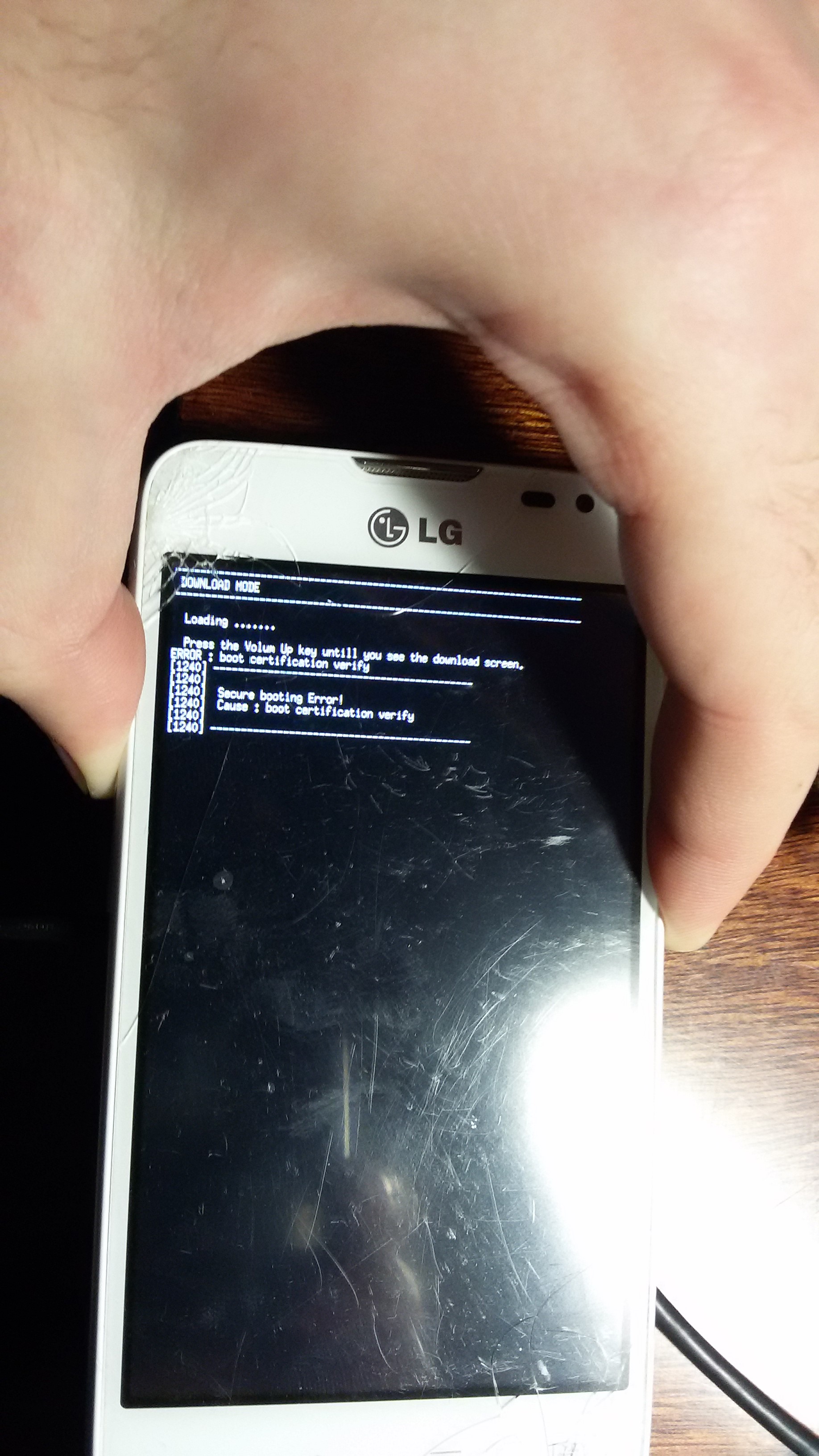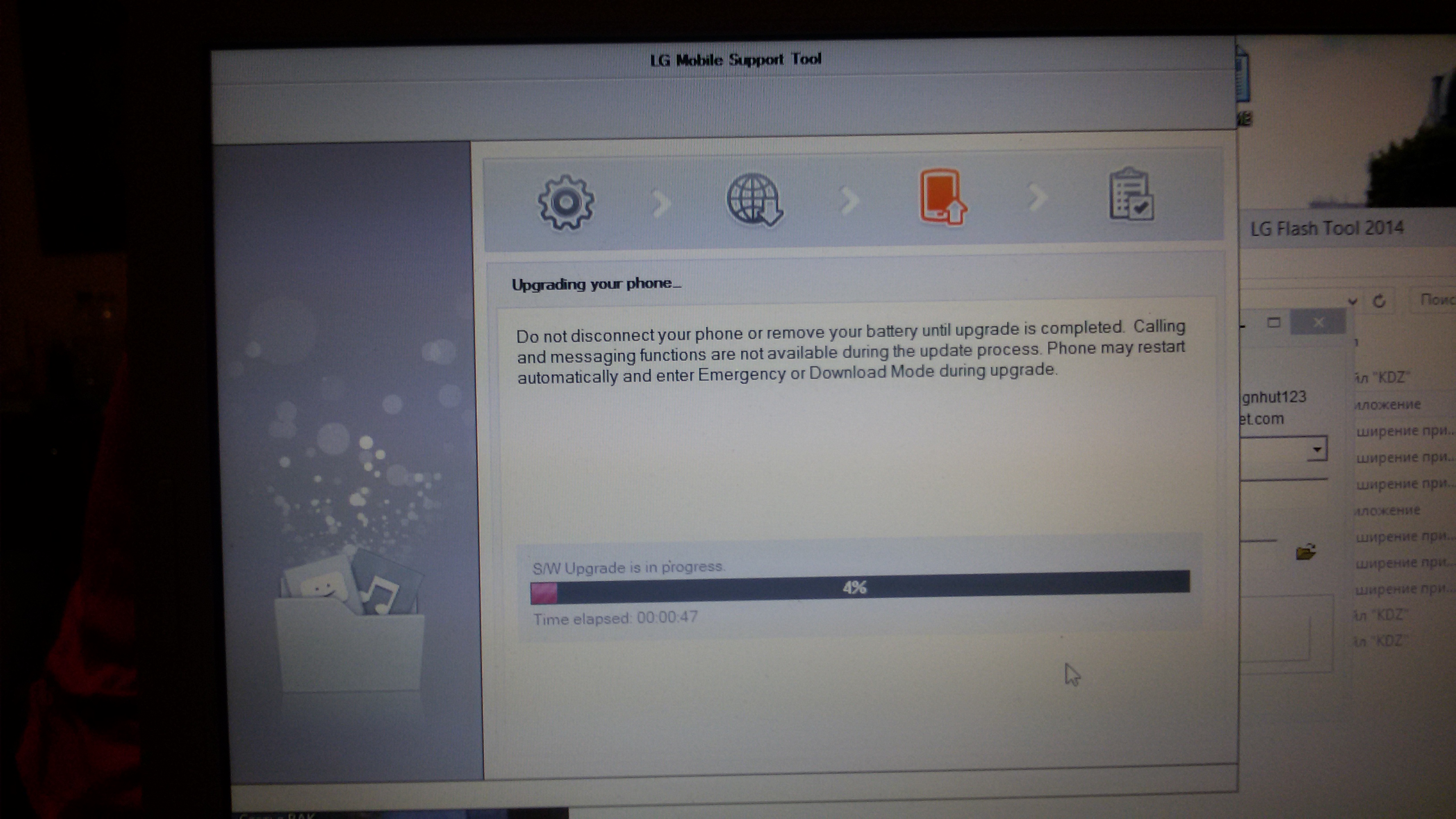 LG Mobile Support Tool начнет проверку и выдаст сообщение о не подключенном устройстве. Удерживая клавишу Volume Up (Громкость +), подключаем телефон к ПК и нажимаем на кнопку Повтор в программе