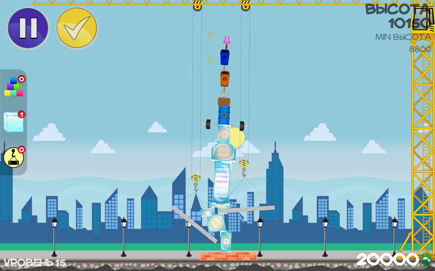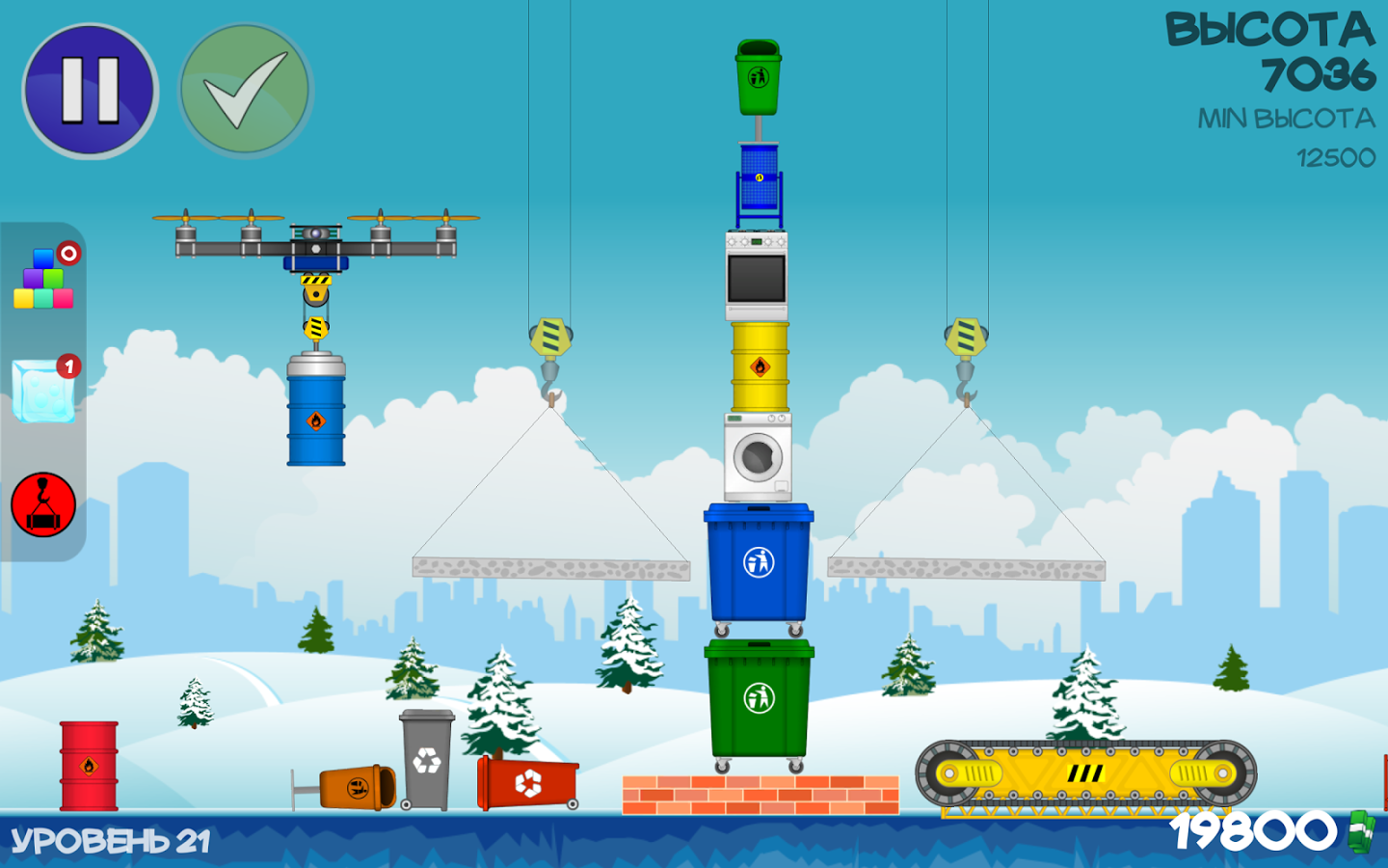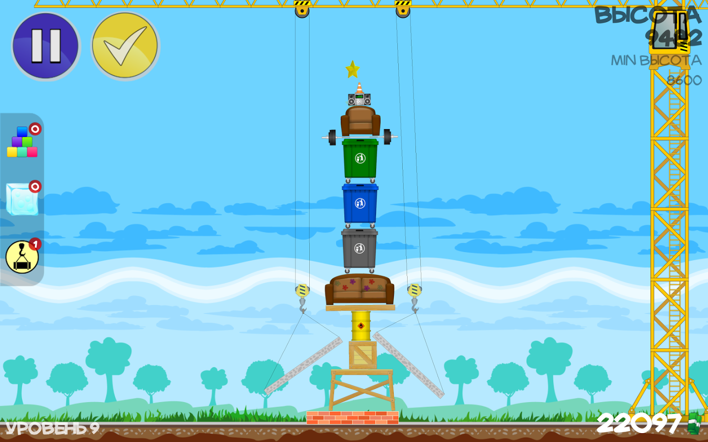 • У вас есть возможность приобрести в игровом магазине новые блоки и уникальное устройство “кранкоптер”, которое поможет более точно выставлять элементы башни на протяжении всей игры.
