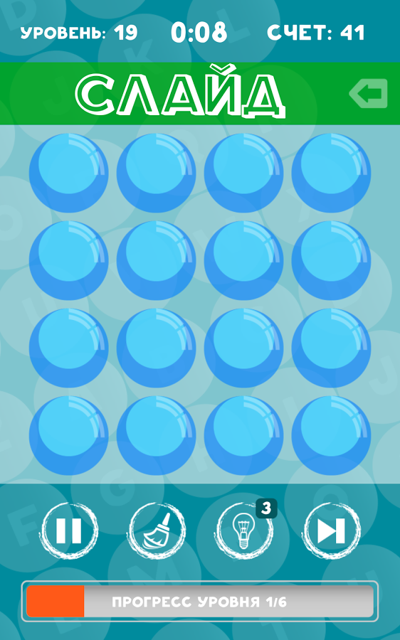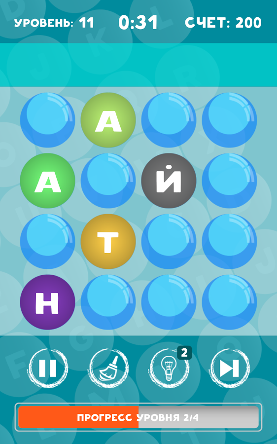 Для прохождения доступны 100 уровней с нарастающей степенью сложности на двух языках: русском и английском. Если у Вас возникли трудности с составлением слова, вы можете воспользоваться подсказкой или пропустить текущее слово и перейти к составлению следующего. По окончании каждого уровня дополнительно можно посмотреть перевод всех слов.