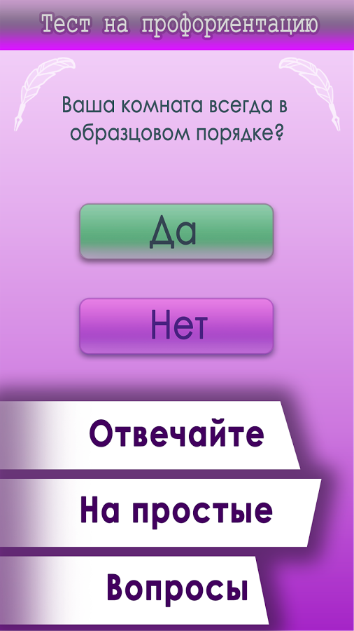 Психологический тест на профессию включает в себя 20 простых вопросов, например, «Вы способны стойко переносить неудачи?» Чтобы получить правдивый результат, старайтесь отвечать честно. Мы не можем дать гарантию точности, для более точного результата обратитесь к специалисту.