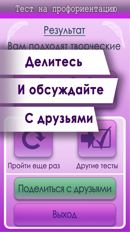 Вы можете пройти психологический тест и получить краткий анализ вашего характера, ваших деловых качеств и короткий список подходящих профессий. В список включены самые востребованные и самые высокооплачиваемые профессии.