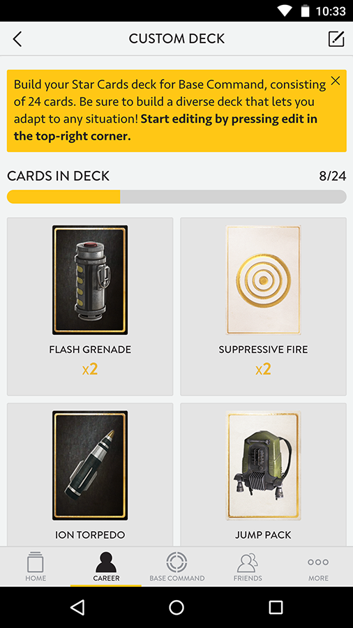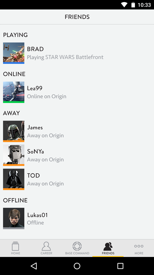 Где бы вы ни находились ― в далекой галактике или у родного очага, ― готовьтесь к битве в приложении Companion для Star Wars™ BATTLEFRONT™. Встроенная в приложение стратегическая карточная игра Base Command поможет вам заработать внутриигровые кредиты, за которые можно приобрести звездные карты, бластеры и иные полезные предметы для Star Wars BATTLEFRONT. Кроме того, приложение позволяет игрокам следить за своей статистикой и прогрессом в игре, менять наборы звездных карт и свой внешний вид, переписываться с друзьями и получать уведомления об их входе в Star Wars BATTLEFRONT. Сравнивайте их статистику и прогресс со своими!