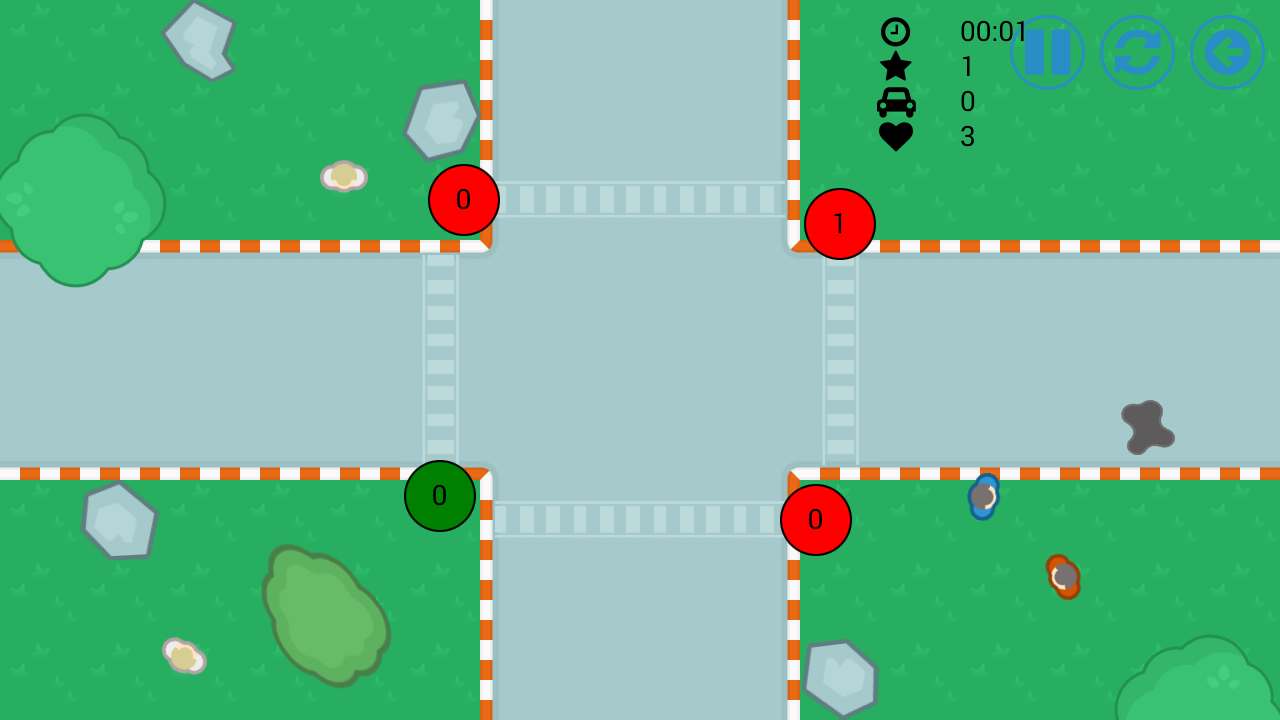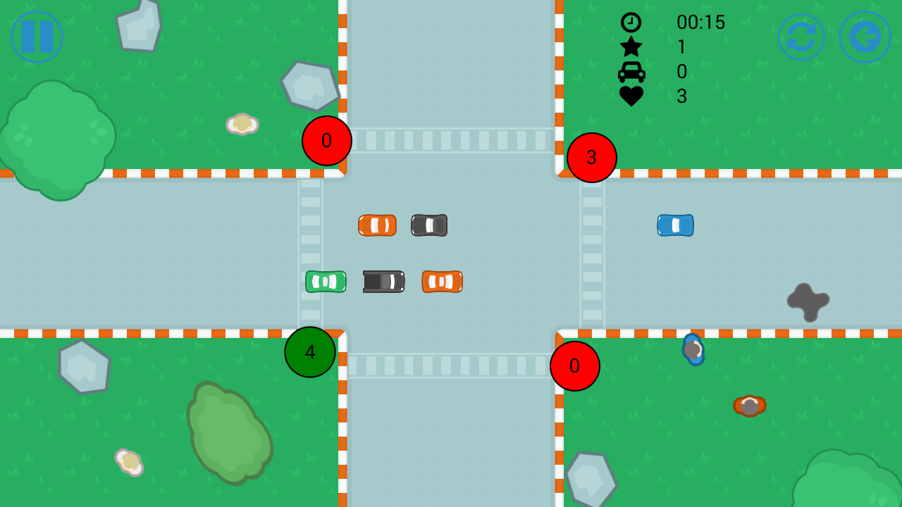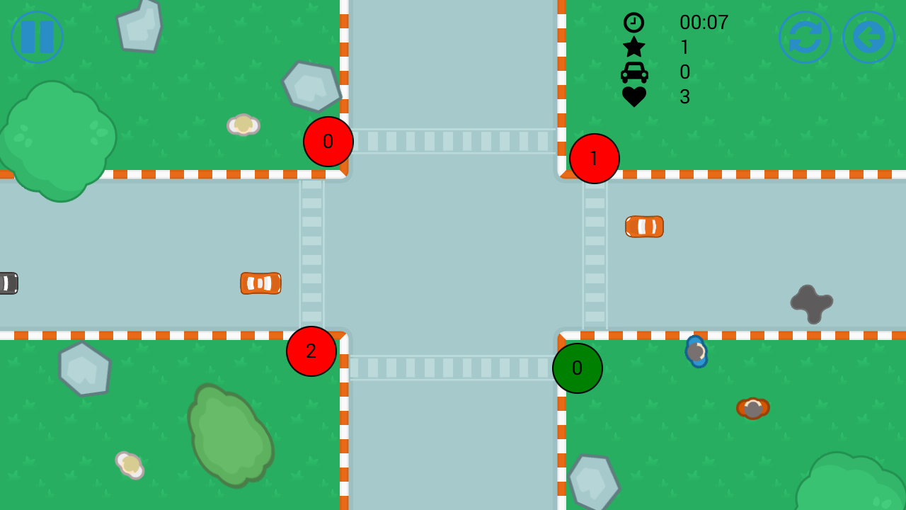 Попробуй свои силы в регулировании плотного потока автомобилей. Ты должен не допустить аварии и пропустить как можно больше автомобилей через регулируемый перекрёсток.