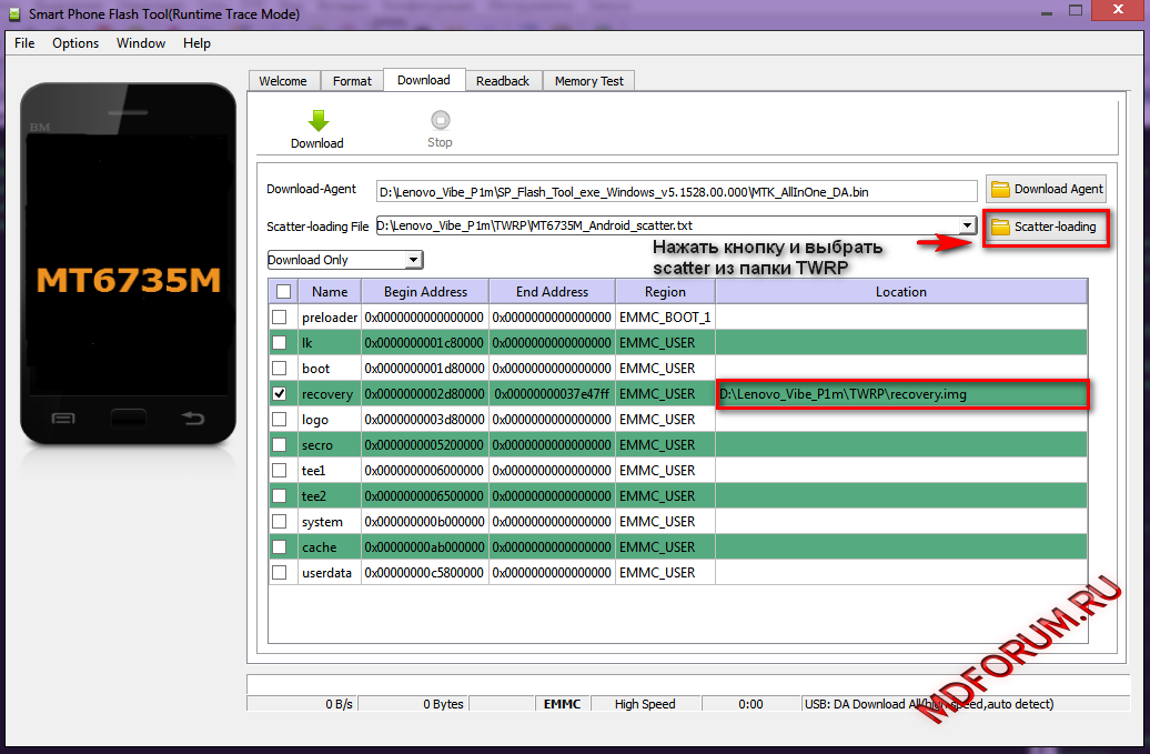 5. Нажать на кнопку scatter-loading и выбрать файл MT6735M_Android_scatter.txt из папки TWRP.