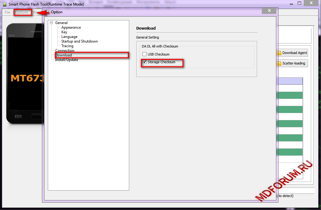 6. Зайти в настройки SP Flash Tool, перейти во вкладку Download и поставить галочку на против пункта storage cheksum