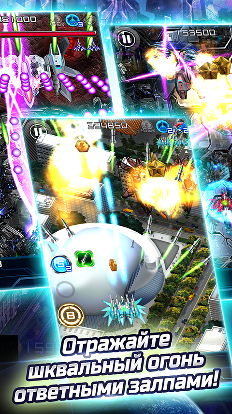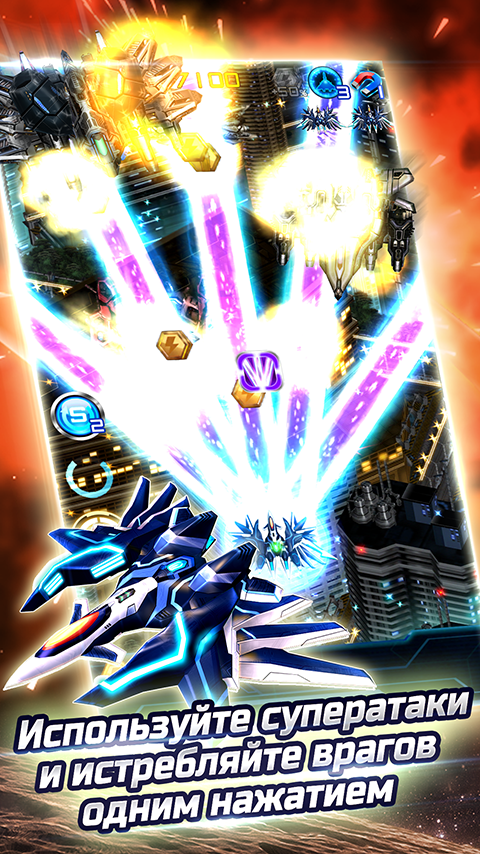 ‧ «Молния» сражается не в одиночку! В игре можно построить новые истребители. Каждый из них отличается 3 видами мощного оружия и особыми атаками.