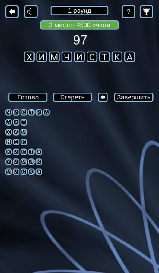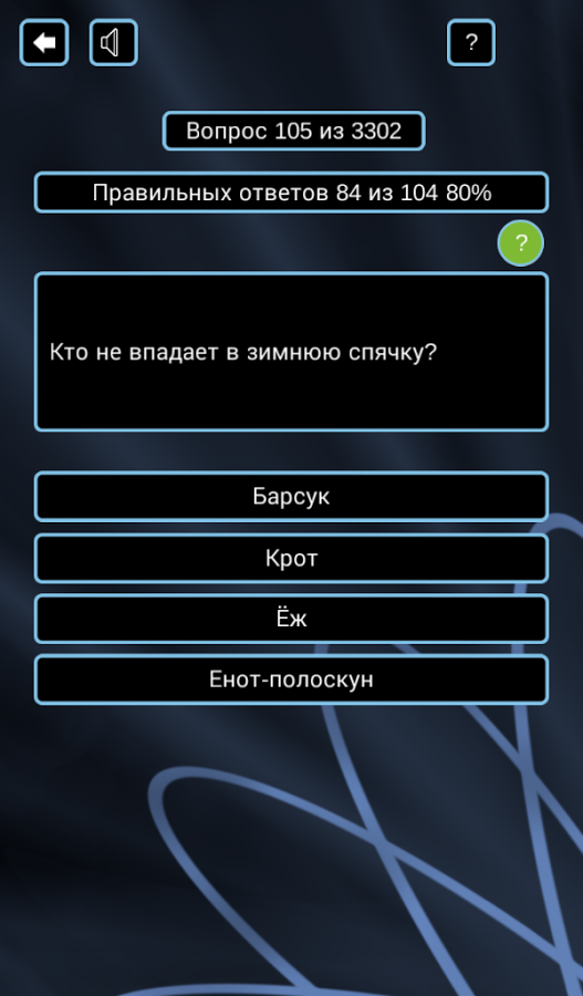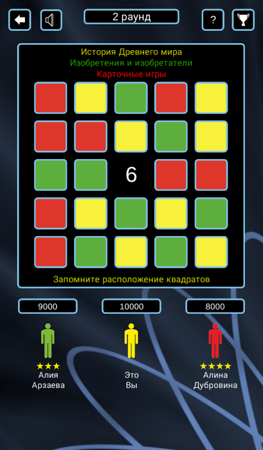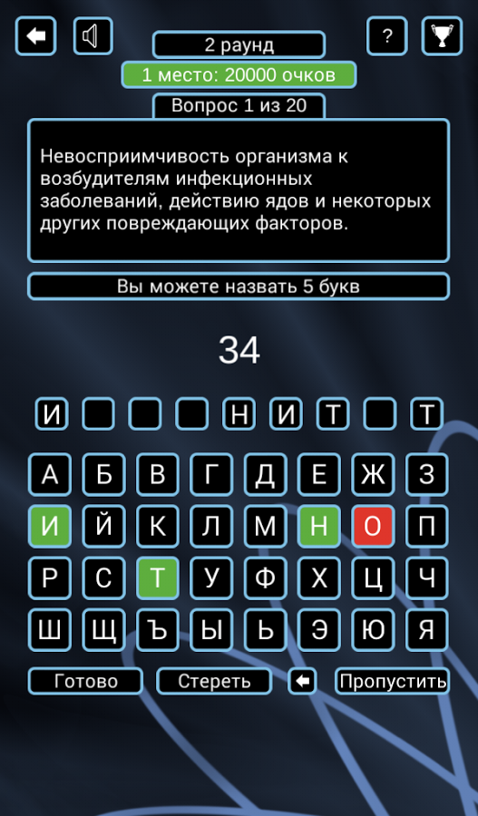 Цель игры: по результатам всех раундов занять первое место по набранным очкам. Вам противостоит 24 игрока, управляемые компьютером. За каждый правильный ответ вам начисляются очки. После каждого раунда игроки, набравшие минимальное количество очков, выбывают из игры.