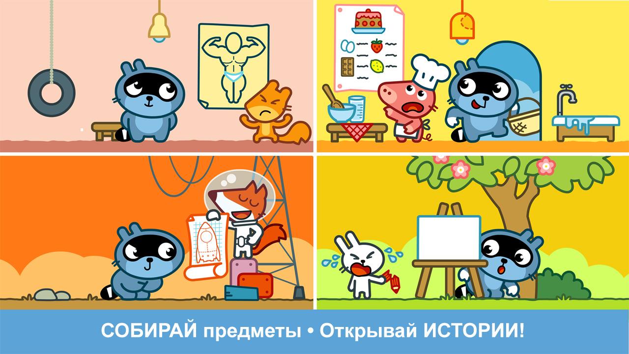 Панго должен будет собрать и принести 8 ингредиентов на кухню Хрюшки, 8 инструментов для ракеты Лисички, спортивный инвентарь для Белочки и цветные мелки для рисунков Кролика...