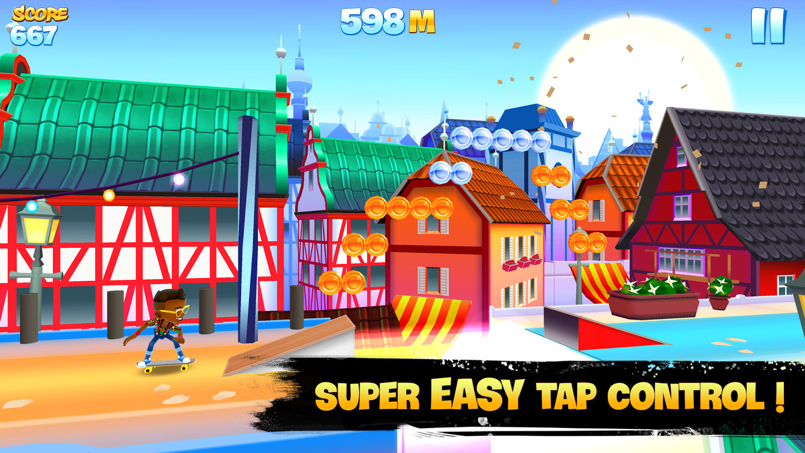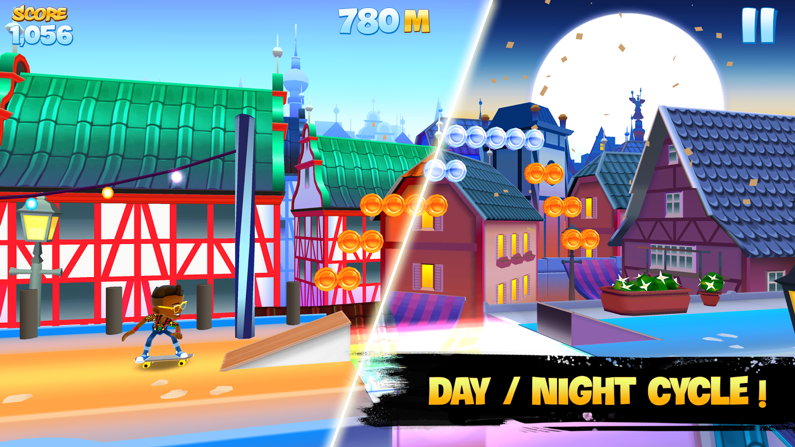 Вам нравится Subway Surfers? Тогда и эта андроид игра должна вам понравиться! Игра выполнена в таком же стиле, но с немного измененной идеей и видом. Теперь вы будете ездить по крышам домов, при этом собирая монеты и перепрыгивая препятствия. Но не забывайте, что за вами гонятся полицейские вертолеты. Если вы замешкаете или где-либо споткнетесь – вас поймают! За собранные монеты вы можете открыть другие скейтборды и одежду.