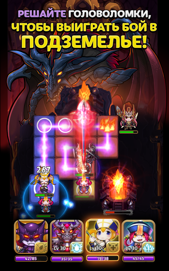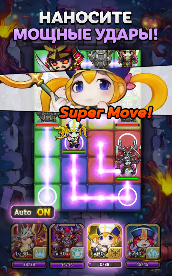 Чтобы атаковать противников, соедините между собой одинаковые клетки. Если вам удастся провести линии через все клетки на поле, вы нанесете мощный удар!