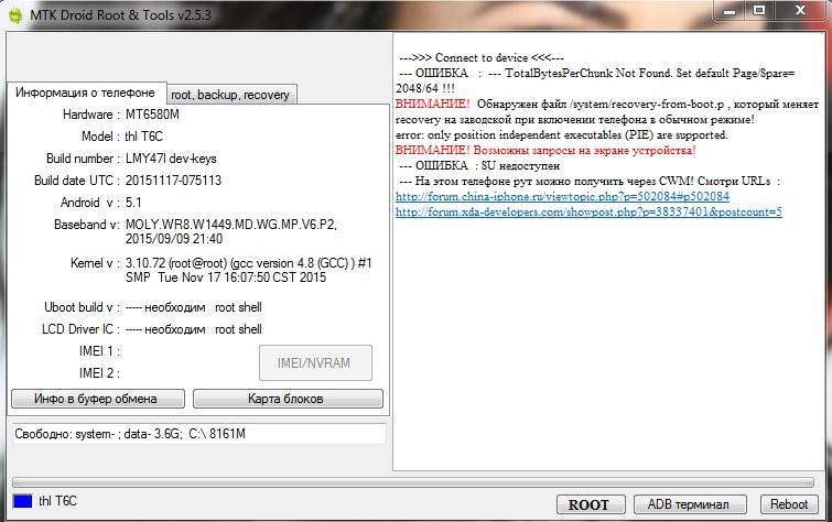 Доброго времени,телефон THL T6C на процессоре 6580m,android 5.1.Обычными программами вроде kingroot,farmaroot и прочими не удалось,так же взял twrp recovery и скаттер от dodge x5,он тоже на 6580.После включения flash tool (перед этим установлены все драйвера) и подключение отключенного телефона ничего не происходит,в устройствах в панели управления он появляется как носитель vcom preloader(com9) и тд.Но flash tool телефон не видит и прошивка не начинается.Помогите получить рут и сменить стандартный рекавери...Adb run и mtk droid телефон видят,но толку от них нету.Или как проверить разлочен ли бутладер?