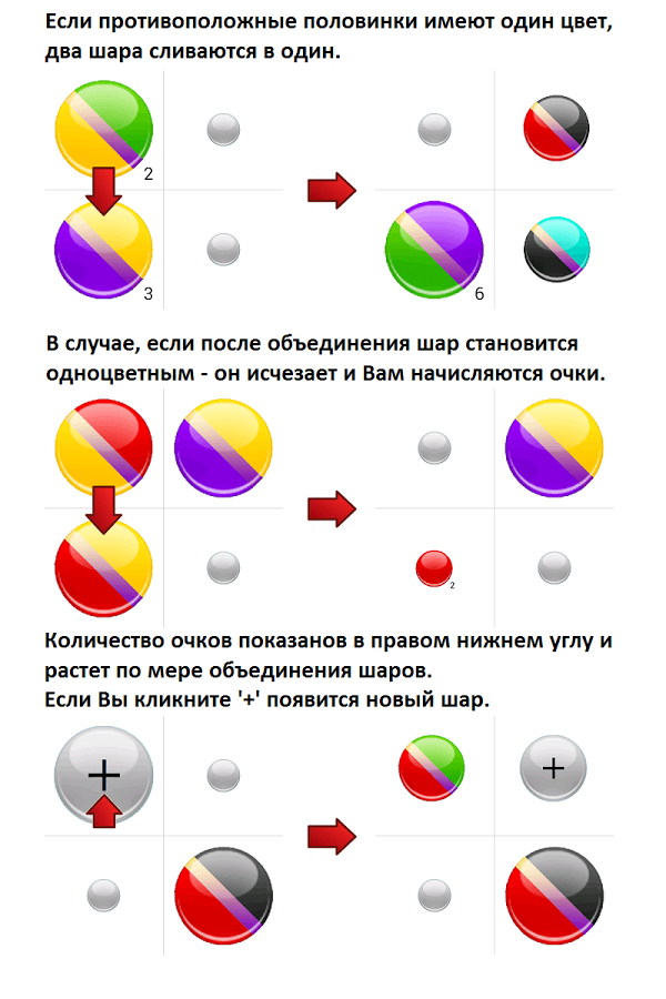 В случае, если после объединения шар становится одноцветным - он исчезает и игроку начисляются очки.