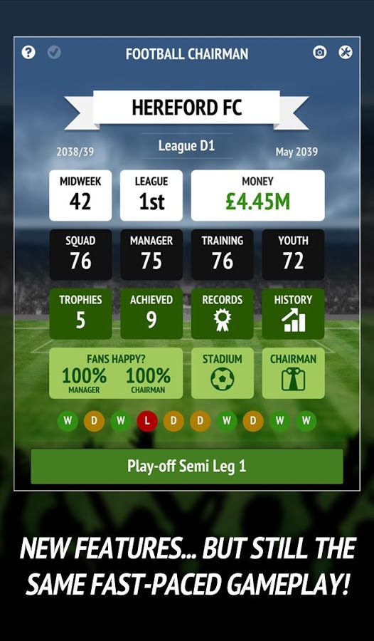 Football Chairman - футбольная игра, в которой вам предстоит построить свою футбольную империю. Создайте футбольный клуб, начиная с одной команды, и за короткое время выведите его в лигу. Наблюдайте за тем, как ваша команда выигрывает один матч за другим и делайте все для ее победы. Развивайте свой стадион, продавайте билеты на матчи и заводите нужные контакты со спонсорами, которые будут вкладывать деньги в вашу команду.