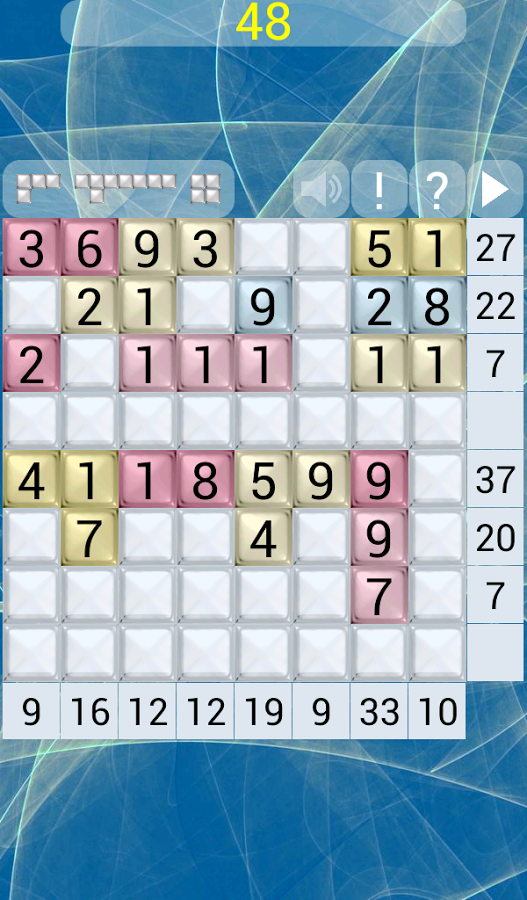 Цель игры размещать фигурки на поле 8 на 8, так чтобы сумма цифр, на всех элементах фигурок, попавших в одну горизонталь или вертикаль была равна 40.