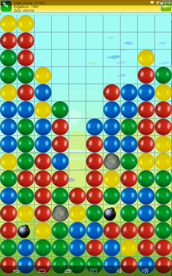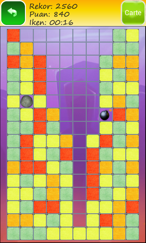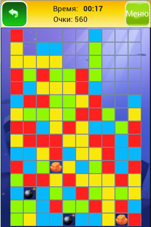 Цель игры - удалить как можно больше квадратиков на поле. Два и более квадратов одного цвета можно удалить на поле, когда они находятся рядом друг с другом. Они исчезают с доски и все остальные камни перемещаются вниз и влево, занимая освободившиеся поля. Если ходов больше нет - игра закончится.