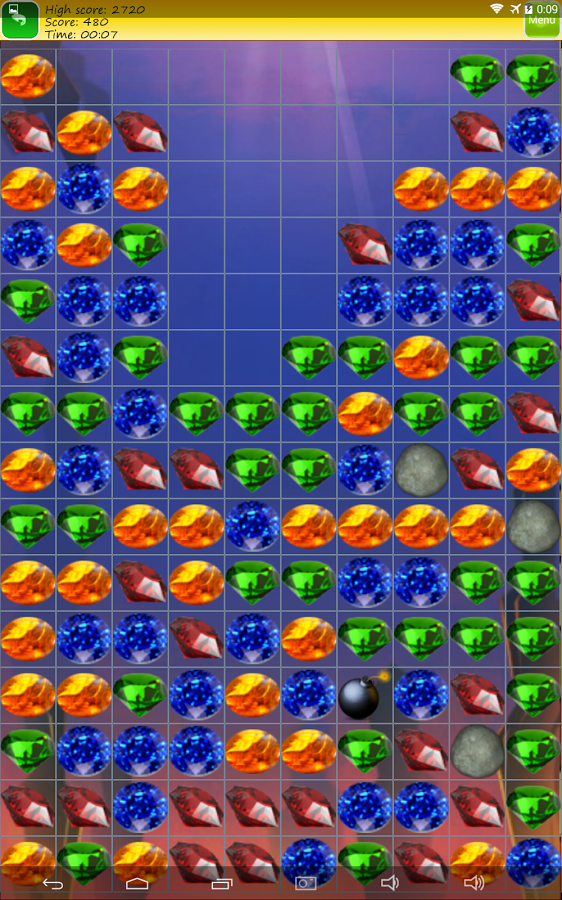 В настройках игры выбирается размер игрового поля, цвета ячеек,звуковые эффекты, а так же наличие специальных камней и бомбочек.