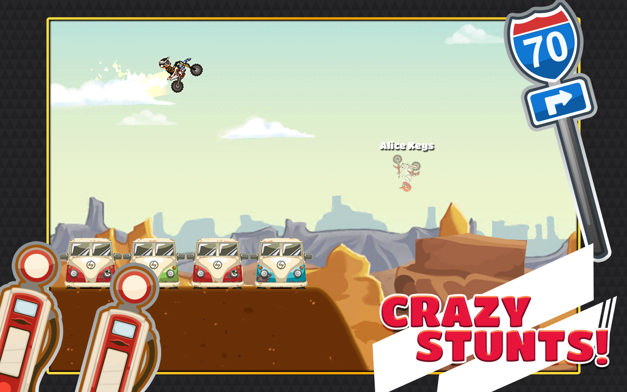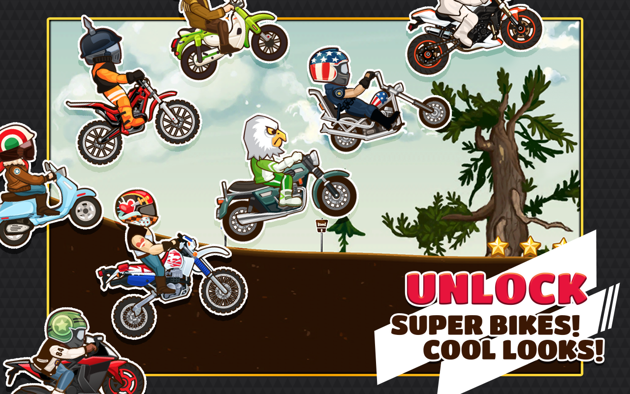 Extreme Bike Trip - игра на аndroid, в которой вы будете гонять по горам на мотоциклах. Выберите себе мотоцикл, настройте своего гонщика и участвуйте в гонках против своих друзей в новом режиме Race Мультиплеер. Выбирайте окружающую среду, по которой будете гонять, и используйте новые бонусы, чтобы добиться лучших результатов.