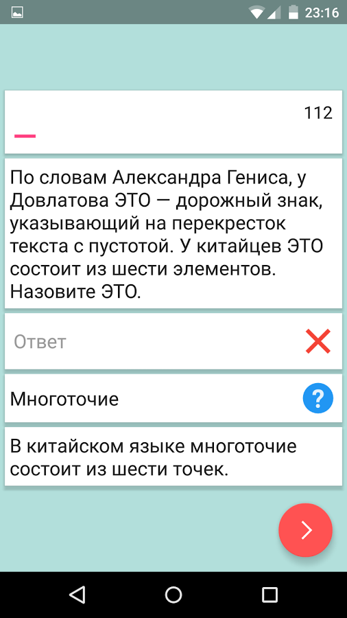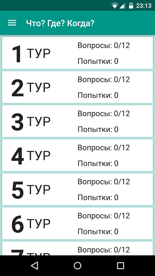 В каждом туре находится по 12 вопросов, на отгадывание каждого вопроса игроку кается 120 секунд, включая время на прочтение вопроса. Вопросы есть как легкие, так и те, над которыми придется серьезно подумать.