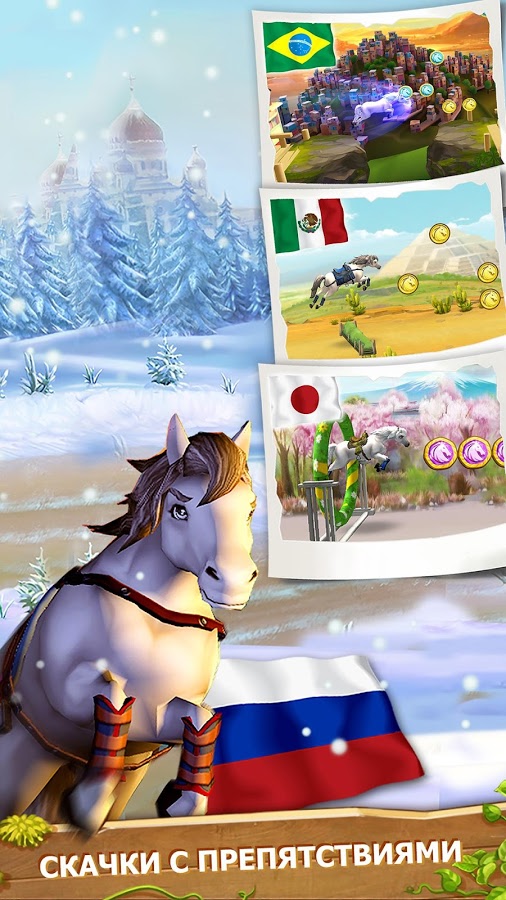 - УЧАСТВУЙТЕ В СКАЧКАХ С ПРЕПЯТСТВИЯМИ ПО ВСЕМУ МИРУ и состязайтесь в самых невероятных местах: в долине пирамид в Мексике, в заснеженных степях России, среди цветущих садов Японии...