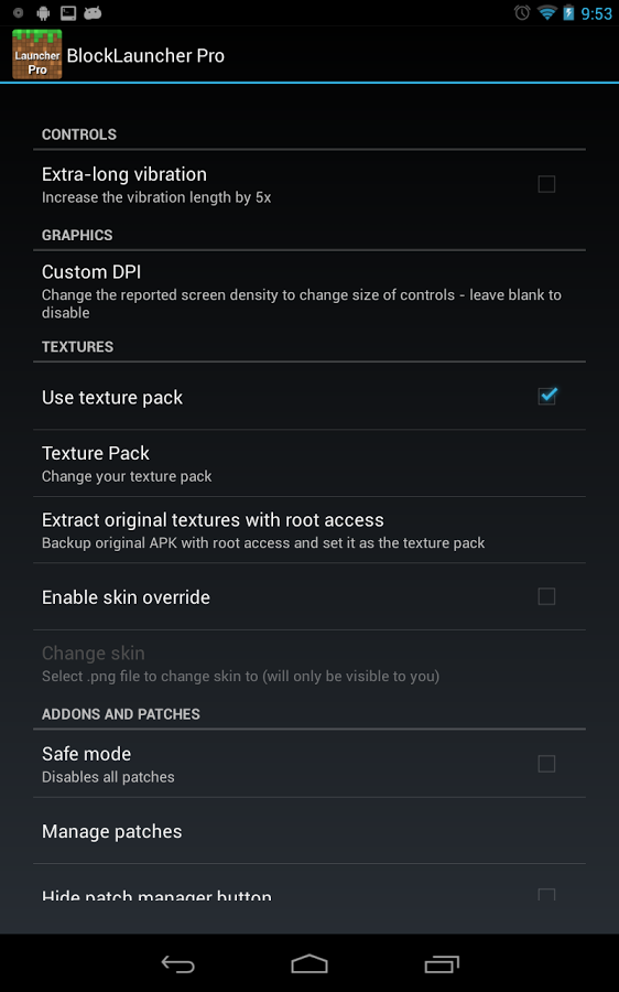 Недавно был создана обертка к игре Minecraft PE - MCPELauncher. Впоследствии, он изменил своё имя на более красивое - BlockLauncher. Он позволяет устанавливать моды, собственные аддоны, текстурпаки, скины и многое другое без переустановки Minecraft PE! Эта программа стоит внимания!