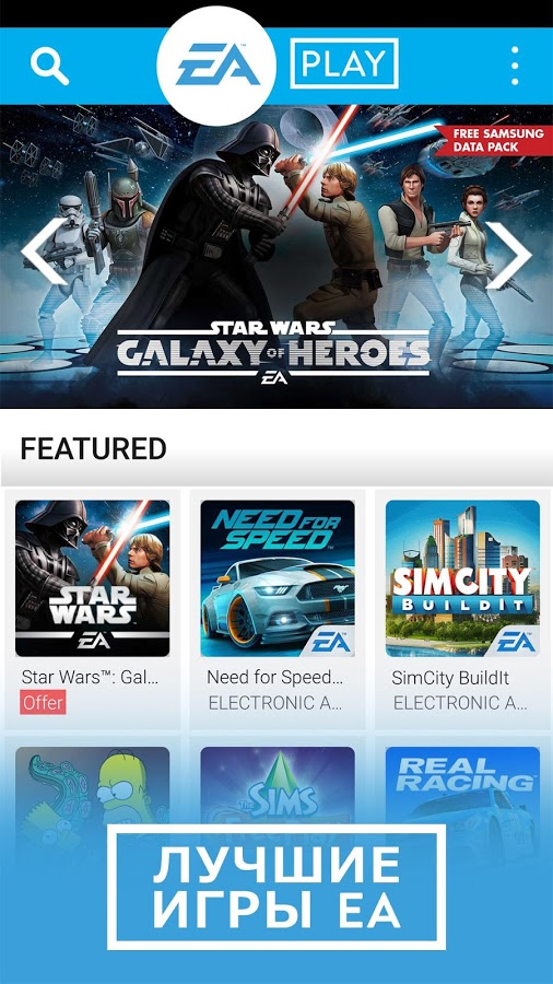 Добро пожаловать в EA Play! Здесь вы найдете лучшие мобильные игры EA. Благодаря EA Play пользователи Samsung смогут воспользоваться отличными скидками и предложениями, а также загрузить новейшие игры в любое время года.
