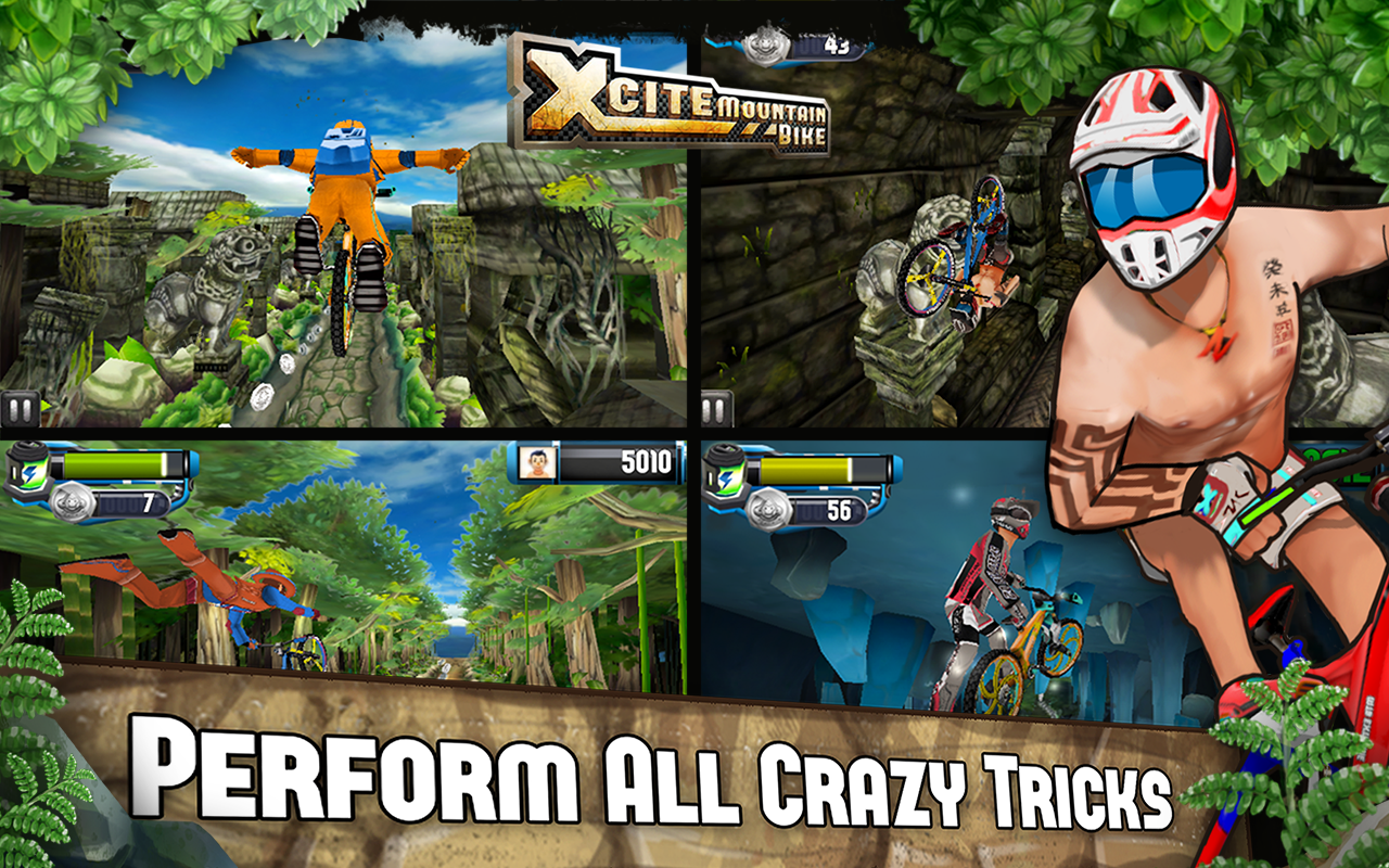 Необычный раннер сj спортивным уклоном для андроид. Вам предстоит ездить на велосипеде по джунглям и собирать монеты, при этом в затяжных прыжках выполнять различные трюки. Для этого выполните комбинацию, которая появится на экране. Весь ваш путь будет проходить в семи различных местностях с 20 различныvb препятствияvb, такиvb как пропасти, бревна, узкие проезды и другие. По ходу прохождения вы изучите восемнадцать различных трюков, большинство из которых используют профессиональные велосипедисты. Также в игре есть возможность переодеть своего игрока или купить ему новый байк.
