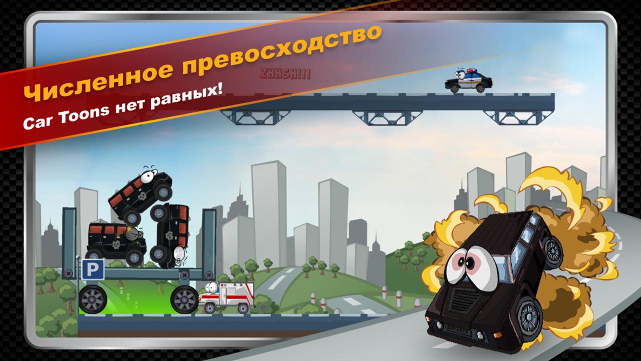 CAR TOONS никогда не покидают гараж без пристойного нового снаряжения. Используй его с умом, чтобы убрать все плохие тачки с экрана. Пройди более 100 мастерски созданных миссий. Обведи банду вокруг пальца и сверши правосудие!