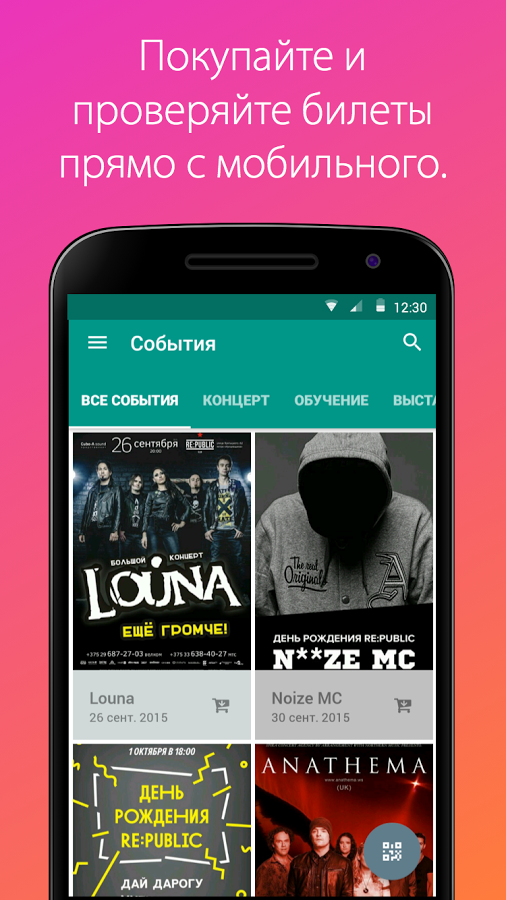 - Удобно и безопасно покупать билеты на концерты, выставки, вечеринки и другие события.