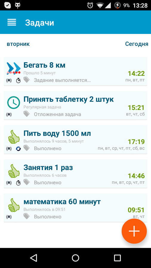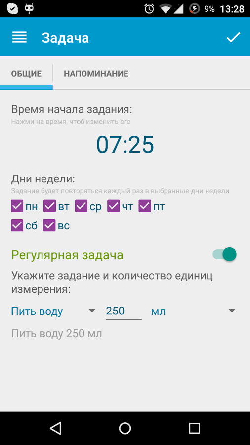 В приложении можно создавать регулярные (шаблонные) и разовые задачи. Пользователь при этом задает набор параметров: время, дни недели, тип, наименование, количество и единицы. Задачи можно повторять и смещать по времени. Можно также вносить корректировки в результат, если он отличается от шаблонного. В статистике фиксируется фактическое количество. Кстати, слишком увлекаться переносом задач нельзя — это возможно лишь в пределах одной недели. Какой-никакой, но стимул, позволяющий избежать долгосрочного планирования.