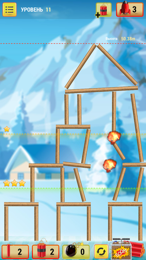 - Различные материалы построек и типы взрывчаток, добавляют сложность и интерес к игре.