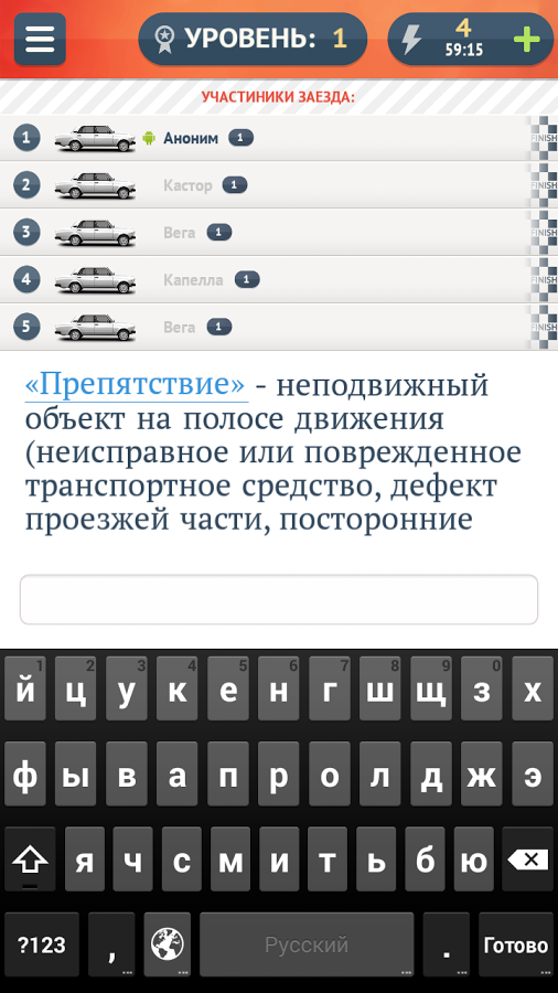 В нашей игре вы будете соревноваться с другими людьми или ботами в скорости набора текста на клавиатуре вашего телефона. Правила предельно просты: вам будет предложен один из 1000 фрагментов текста на русском или английском языке и вы на перегонки начнете его собирать. Кто первый поставит последнюю точку в тексте - тот и победил.