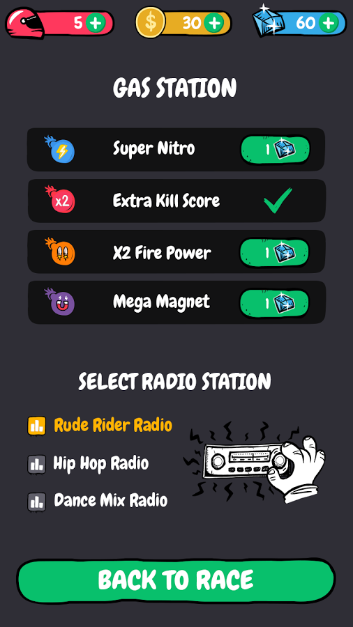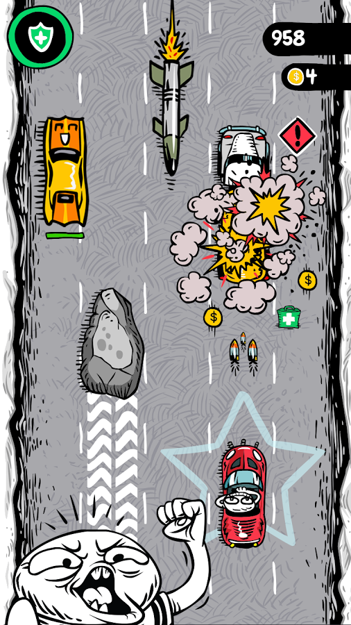 Viber Rude Rider – управляйте бесшабашным водителем, который мчится на огромной скорости по улицам города и взрывает встречные машины. Лавируйте в бесконечном потоке машин и уклоняйтесь от различных преград и препятствий. Обгоняйте встречные машины и соперников и взрывайте их автомобили с помощью пушек и ракет. Не забывайте собирать по пути золотые монетки и кристаллы они пригодятся вам для покупки новых машин и усилений. Применяйте нитро ускоритель и устанавливайте свой рекорд по прохождению трассы. Особенностями игры является оригинальная графика, вид сверху и простое управление.