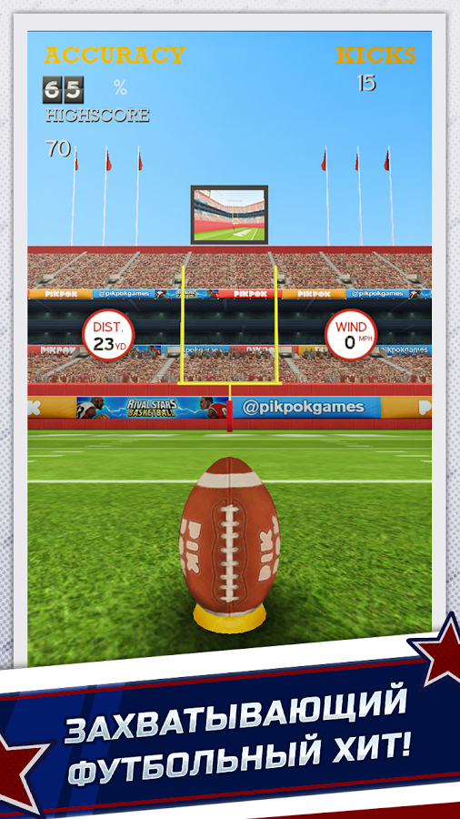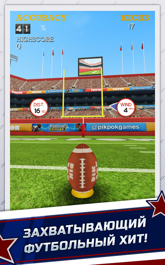 Благодаря простому в освоении управлению и непростым заданиям от Flick Kick® Field Goal просто невозможно оторваться! Бей по мячу в постоянно меняющихся условиях и зарабатывай награды! Демонстрируй свое мастерство в игре, мимо которой не может пройти ни один поклонник американского футбола!