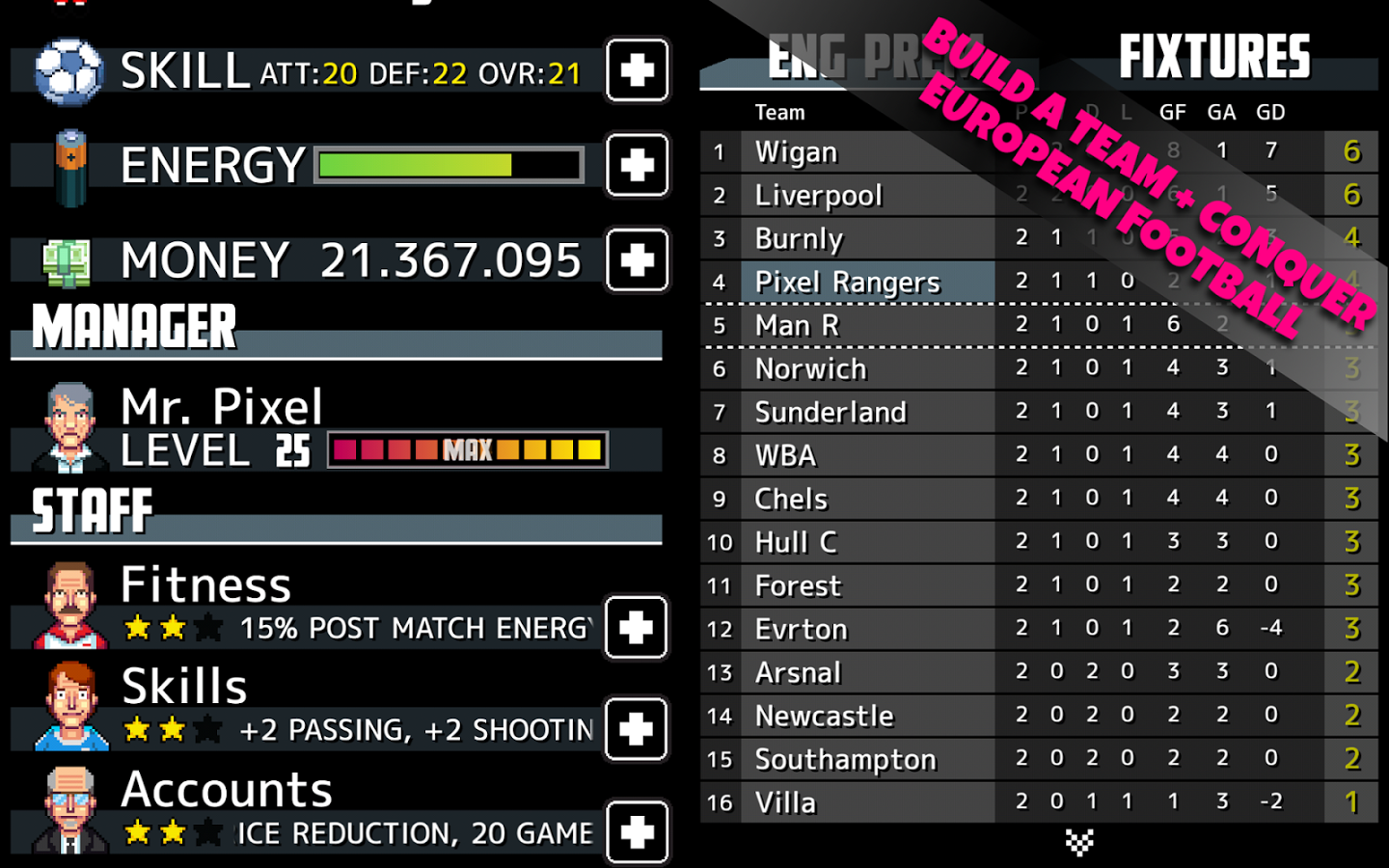 Tiki Taka Soccer – увлекательная футбольная игра с сенсорным управлением на андроид. В этой игре вашей главной задачей будет создать свою футбольную команду и привести ее к победе на главном чемпионате мира. Набирайте в свою команду самых лучших игроков, обучайте и тренируйте их, перед тем как выпустить на поле. Управляйте сразу несколькими игроками и рисуйте траекторию их передвижения и меча. Забивайте один за другим голы в ворота соперников и поднимайтесь выше в таблице лидеров. Зарабатывайте достаточное количество денег, чтобы приобрети в свою команду лучших футболистов и нанять профессионального тренера, бухгалтера, фитнес тренера и поднять свою команду на новый уровень.